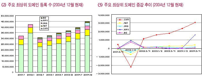 일반 최상위 도메인(gTLD, Generic Top Level Domain) 7개 중 전세계 누구나 자유롭게 등록할 수 있고 잘 알려진 도메인이 바로 com, net, org입니다.이 세개의 도메인 중에서도 인지도와 선호도가 가장 높은 도메인은 단연 com이며 2004년 7월 현재 3천여만개의 도메인이 등록되어 있습니다. 인구가 폭발적으로 증가하고 인터넷 산업이 호황을 누리면서 도메인 또한 폭발적으로 등록되었으며 개인이든 회사든 간에 자신의 사이트의 주소로 .com을 사용하는 것을 선호하고 있습니다.com 도메인은 포화상태라는 분석에도 불구하고 현재도 꾸준히 등록되고 있으며, 이러한 포화상태가 새로운 도메인에 대한 요구로 발전되어 다국어 도메인과 새로운 일반 최상위 도메인(New gTLD, New Generic Top Level Domain)이 출현하게 되었습니다.