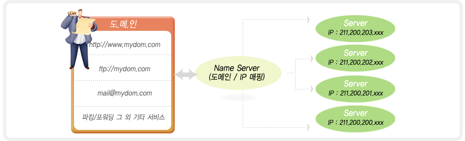 | (2) 도메인(Domain) : 도메인 등록 대행사를 통해 등록 및 관리가 이루지며, 등록한 후 도메인을 이용해 서버호스팅, 웹호스팅, 파킹/포워딩, 이메일 등의 다양한 서비스를 이용할 수 있습니다. 네임서버에 세팅됨으로서 해당 서버의 IP와 연결되어 접속되어 집니다. |
