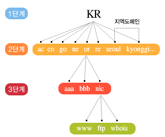 KR 도메인은 3단계로 구성됩니다. 1단계 도메인인 KR 이하에 기관의 성격 또는 지역에 따른 2단계 도메인을 적용하며, 3단계에서 신청기관의 도메인이름을 사용할 수 있습니다. 한국인터넷진흥원(NIDA)의 도메인이름은 nida.or.kr로서 National Internet Development Agency를 의미하는 nida, 비영리 기관/단체 성격의 or, 한국을 나타내는 kr로 구성되어 있습니다. 또한 웹서비스, ftp 서비스, whois서비스 등을 위해서 www, ftp, whois 라는 호스트이름을 사용합니다.