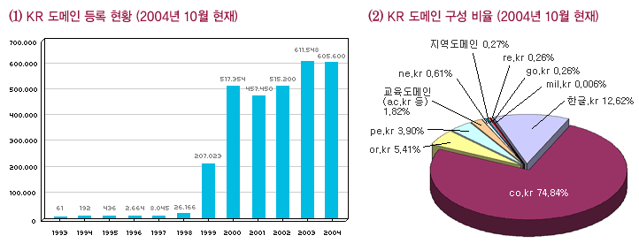 기업이나 회사를 위한 .co.kr 도메인과 비영리기관 또는 단체를 위한 .or.kr 등 모두 6개의 기관 KR 도메인이 사용되고 있습니다. 현재 가장 등록개수가 많은 .co.kr 도메인은 사업자등록증이 있어야 했지만, 2002년 8월 이후에는 주민등록증으로도 신청이 가능해졌습니다.