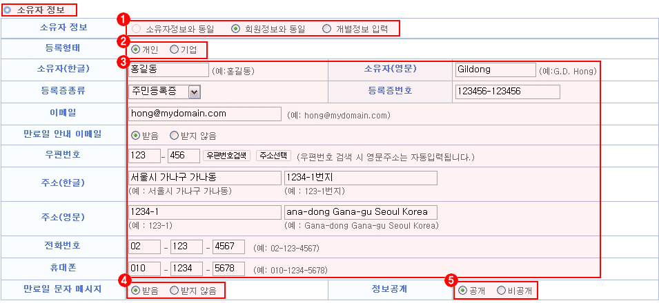 (1) 신청 서비스의 소유자 정보를 회원정보와 동일 또는 다른으로 설정하는 기능입니다. |