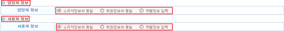(1) * 소유자정보와 동일 : 담당자 정보를 소유자 정보로 자동입력하는 기능입니다. * 회원정보와 동일 : 담당자 정보를 회원정보와 동일하게 입력하는 기능입니다. * 소유자/회원정보와 다름 : 담당자 정보를 직접입력할 수 있도록 초기화하는 기능입니다. |