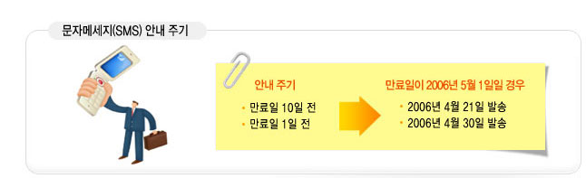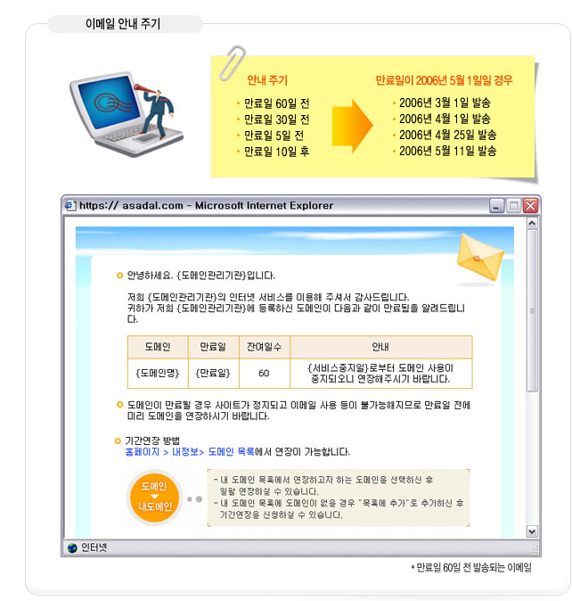 저희에게 도메인을 등록하시면 이메일, 문자메세지(SMS) 를 통해 총 6회에 걸쳐 연장안내를 받으실 수 있습니다.