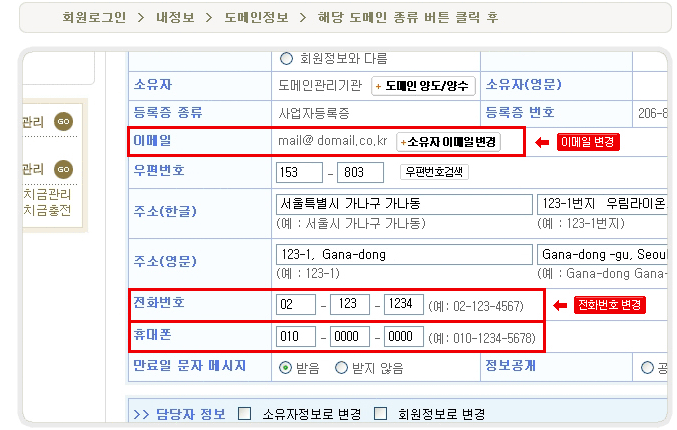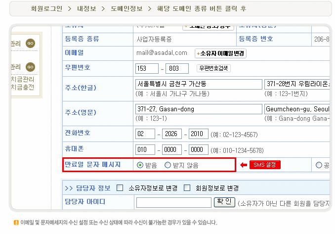 도메인을 등록하시면 이메일, 문자메세지(SMS), 전화 등의 방법으로 총 7회에 걸쳐 연장안내를 받으실 수 있습니다. 이메일과 문자메세지, 전화 안내 등을 모두 받으시려면 항상 도메인 등록자 정보를 최신 정보로 유지해 주시고, 아울러 만료일 문자메세지 받음을 설정하셔야 합니다.